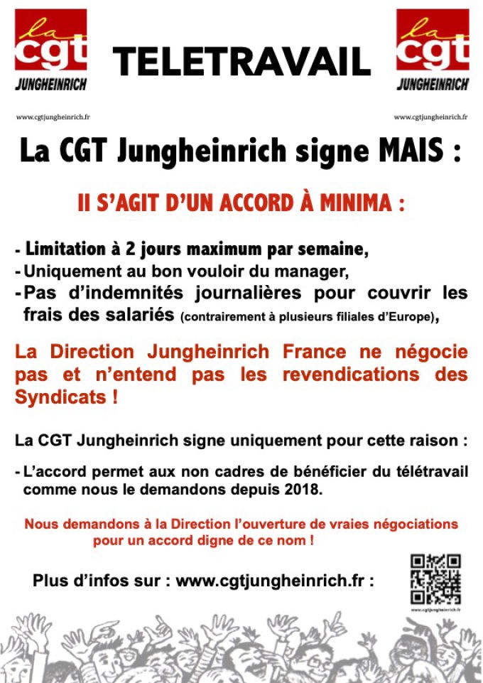 La CGT Jungheinrich négocie pour et dans l'interêt des salariés et met tout en oeuvre pour instaurer tous les aménagements nécessaires pour un accord juste et equilibré.